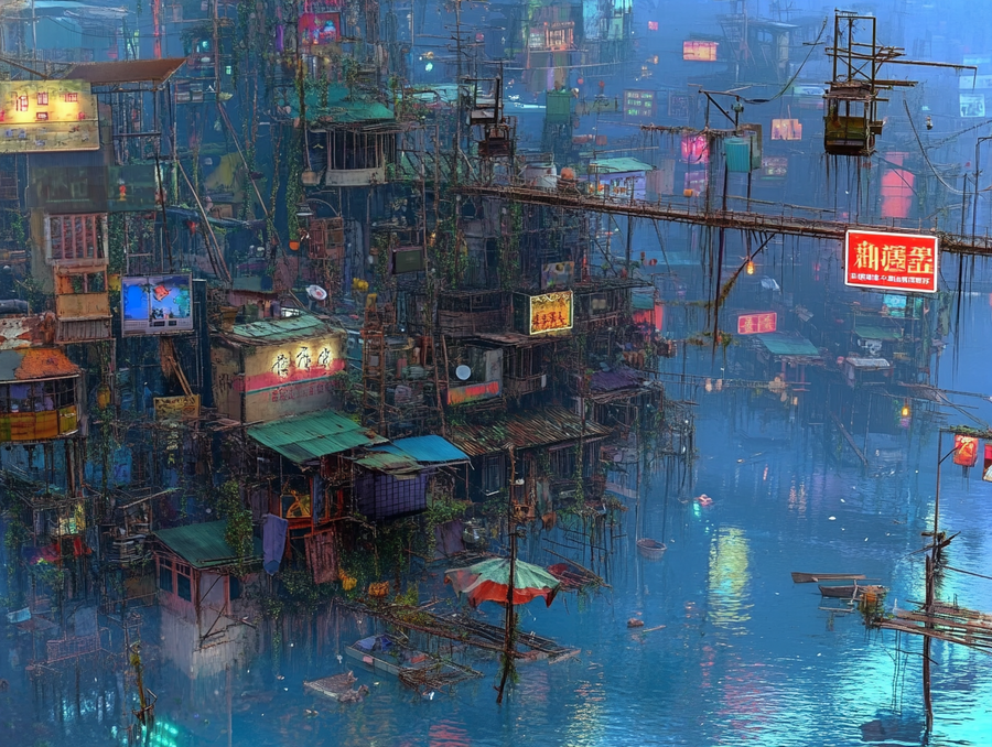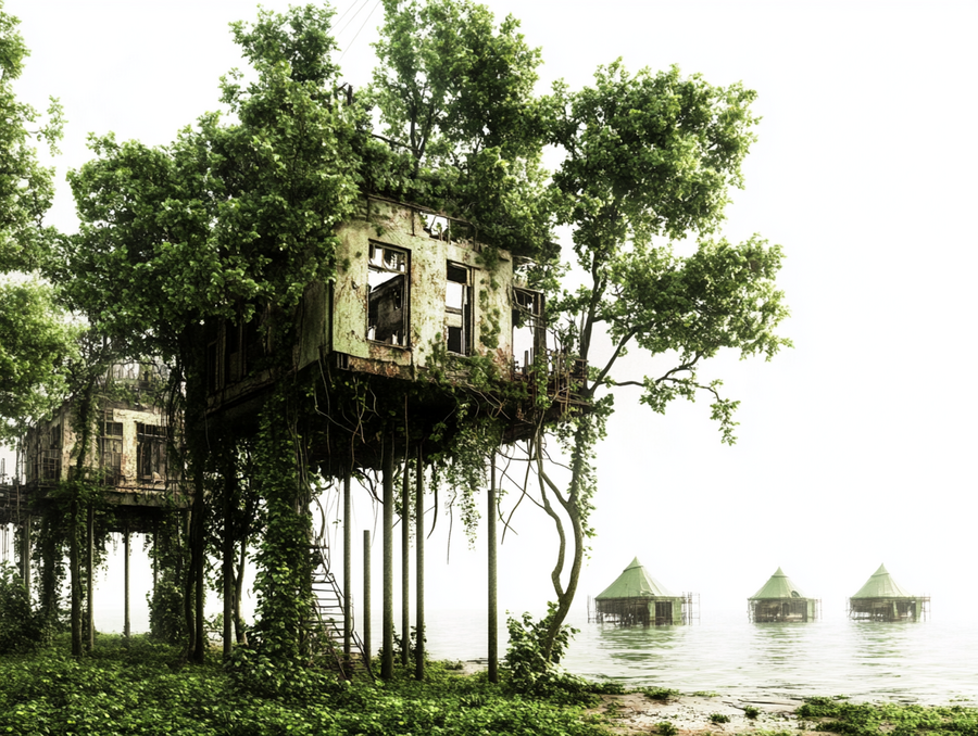An abandoned city submerged in water, where Soviet brutalist towers rise from mist-covered lakes, their rooftops now overgrown with moss and trees. Chinese pagodas, half-sunken, still hold their intricate carvings, while Vietnamese stilt houses cling to the remains of old bridges. Kazakh yurts, floating on rafts, have become homes for wanderers navigating the lost city by boat. Rusted neon signs flicker weakly above the water’s surface, their reflections shimmering like ghosts of a forgotten civilization. The silence is only broken by the wind and the distant cries of birds. The air is thick with an eerie beauty, a world lost in time but not forgotten. Hyper-detailed, cinematic realism, 16K resolution, soft golden light filtering through the mist, breathtaking and haunting. --chaos 40 --ar 4:3 --stylize 750 --weird 100