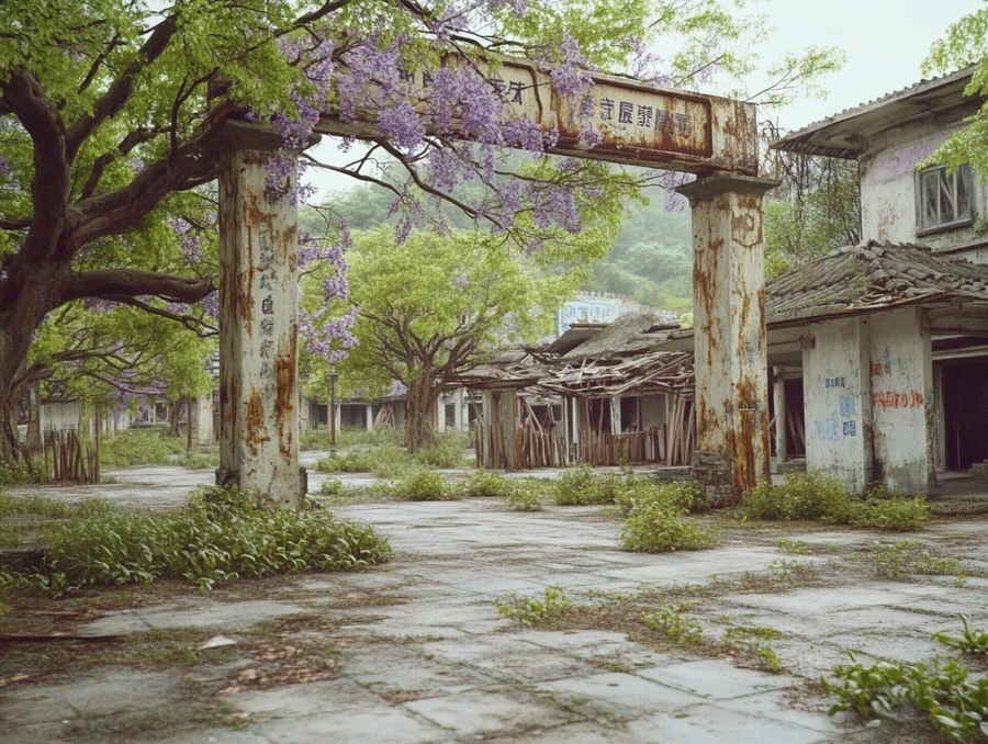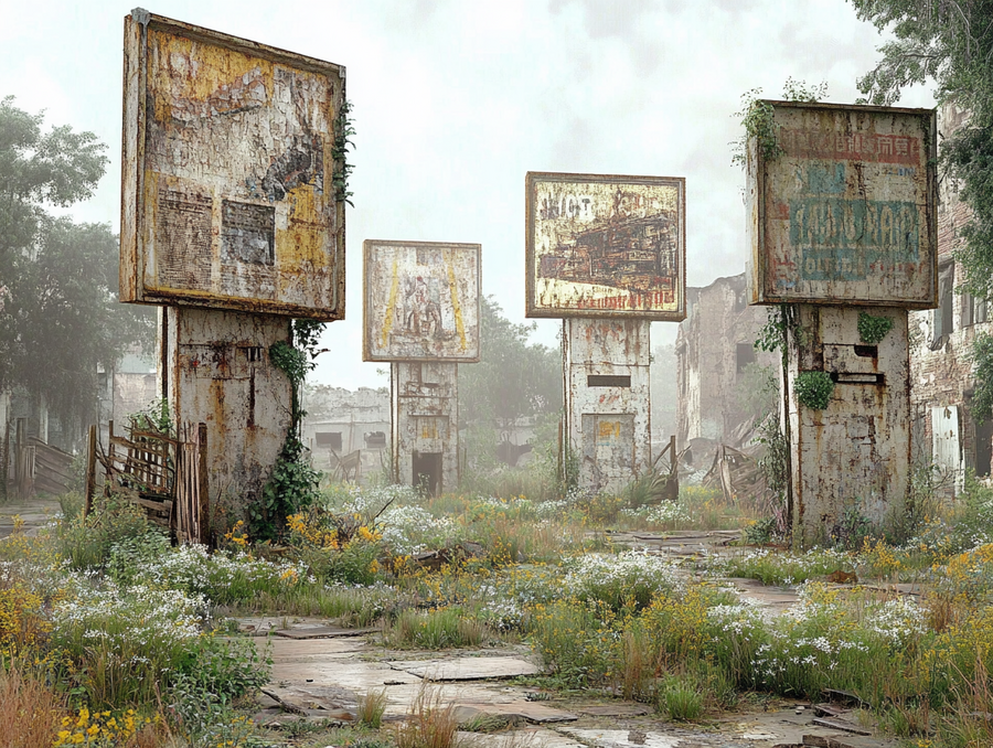 A vast, abandoned city where Soviet concrete towers crumble beneath creeping vines, their surfaces cracked and weathered by time. Chinese palatial gates, now rusted and broken, stand guard over deserted plazas filled with wildflowers and drifting mist. Vietnamese wooden stilt houses, their foundations weakened by age, are slowly sinking into flooded streets. Kazakh yurts, reinforced with scavenged materials, serve as shelters for the few who remain. Above, digital billboards flicker with ghostly remnants of the past, displaying faded propaganda and advertisements from a lost era. A post-apocalyptic world where history, nature, and technology intertwine in a hauntingly beautiful scene. Ultra-detailed, cinematic lighting, hyper-realistic textures, 16K resolution, foggy and dreamlike atmosphere. --chaos 40 --ar 4:3 --stylize 750 --weird 100
