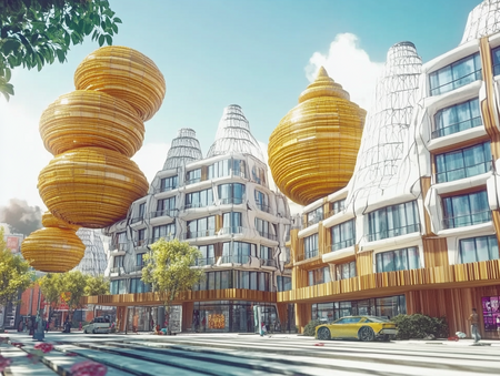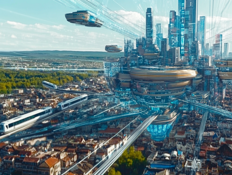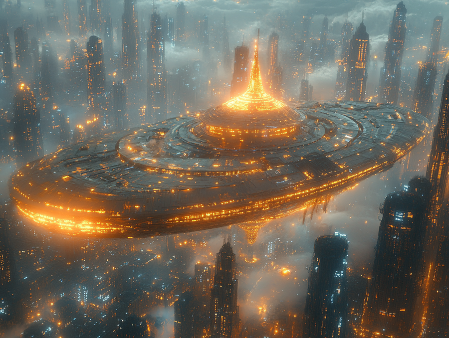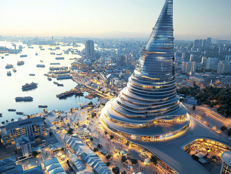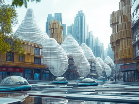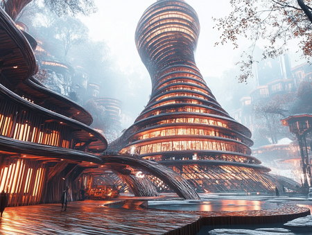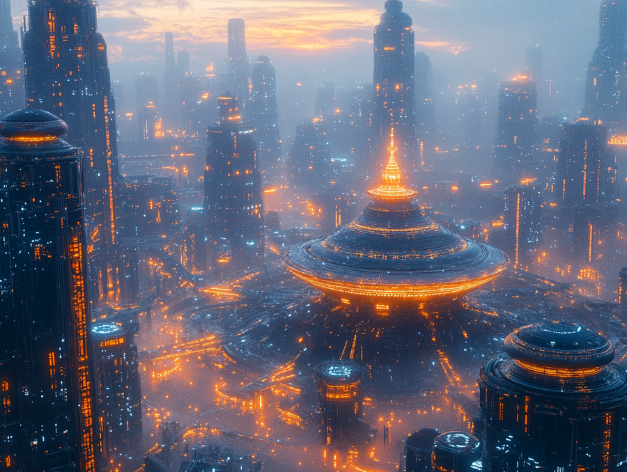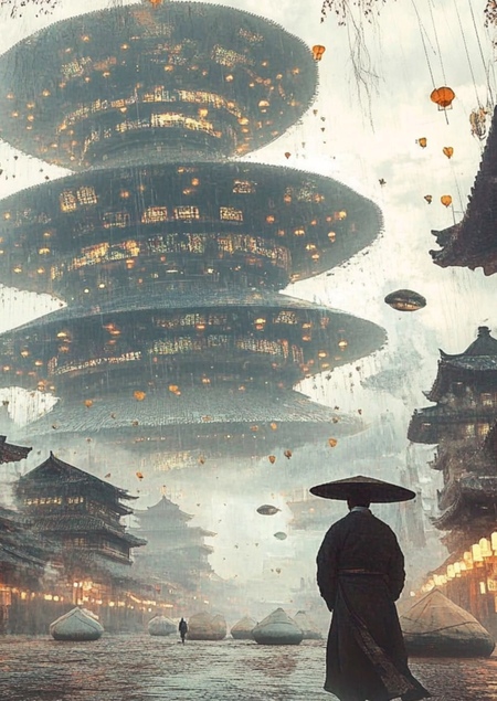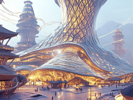 A sprawling open-air metropolis inspired by modernist ideals, where Kazakh yurts have evolved into sleek, mobile housing units, shifting in real time with the seasons. Enormous Vietnamese-style floating platforms hold high-tech marketplaces, where AI-driven commerce thrives under LED lanterns. Soviet-inspired concrete megastructures are softened by cascading vertical gardens, while ancient Chinese dragon reliefs are etched into ultra-modern steel skyscrapers. The city glows under an ethereal golden sunset, reflecting a balance between history and progress. Cinematic, atmospheric, ultra-HD, sci-fi realism with a touch of the ancient world. --chaos 40 --ar 4:3 --stylize 750 --weird 100