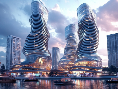A modernist city rising from the vast Kazakh steppes, where futuristic high-rises blend with traditional yurt-inspired structures. The skyline features sweeping glass towers with intricate Turkic motifs, while Soviet-era industrial blocks have been reimagined as vertical green spaces. Vietnamese floating markets hover over an artificial lake, their wooden facades illuminated by soft neon. Russian avant-garde influences create sharp, geometric contrasts between the organic shapes of ancient temples and the steel of space-age urban planning. A city of contrasts, where digital billboards coexist with sacred ancestral shrines. Hyper-detailed, ultra-HD, dusk lighting with cyberpunk hues --chaos 40 --ar 4:3 --stylize 750 --weird 100