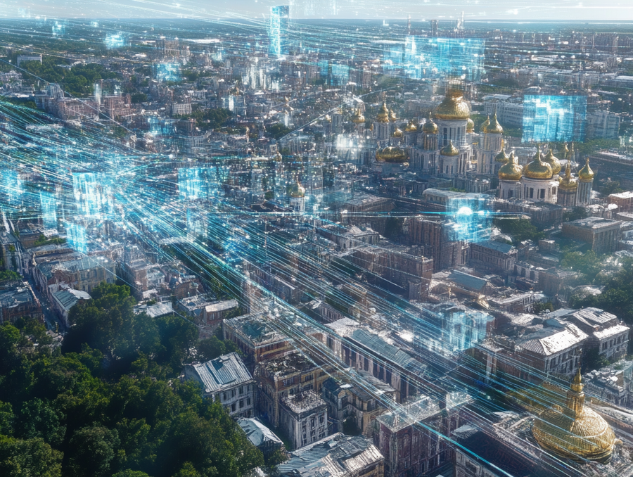 A vast futuristic city that embodies Eurasian modernism, where Kazakh nomadic structures evolve into soaring glass skyscrapers, Soviet brutalist towers transform into sleek digital hubs, and traditional Chinese and Vietnamese rooftops seamlessly integrate with kinetic solar facades. Streets are lined with holographic billboards in Cyrillic and Chinese characters, while AI-powered trams glide past golden-domed stations inspired by ancient steppe architecture. A fusion of history and progress, where traditional markets coexist with drone delivery networks. Ultra-HD, cinematic, hyper-detailed, modern yet deeply rooted in cultural identity. --chaos 5 --ar 4:3 --stylize 700 --weird 100