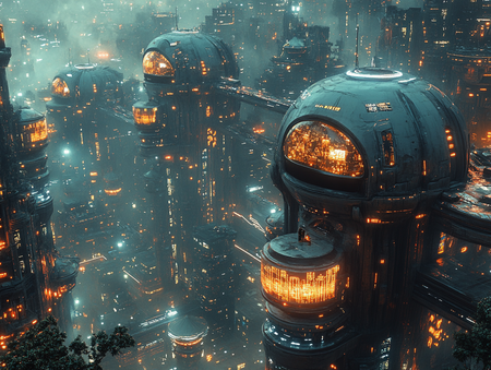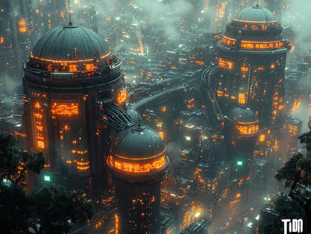 A futuristic modernist utopia where Soviet-era megastructures have evolved into towering cybernetic hubs, adorned with Kazakh and Chinese geometric patterns. Gigantic circular glass domes hover above the city, acting as sustainable ecosystems, while Vietnamese-inspired modular wooden apartments stack like puzzle pieces along a neon-lit skyline. Golden pagoda-like observation decks float above the skyline, reflecting the fusion of past ideologies and future innovation. The streets hum with kinetic energy, where solar-powered hover-trams glide between holographic Leninist murals and futuristic digital yurts. Hyper-realistic, cyber-modernist, ultra-detailed, cinematic lighting --chaos 40 --ar 4:3 --stylize 750 --weird 100