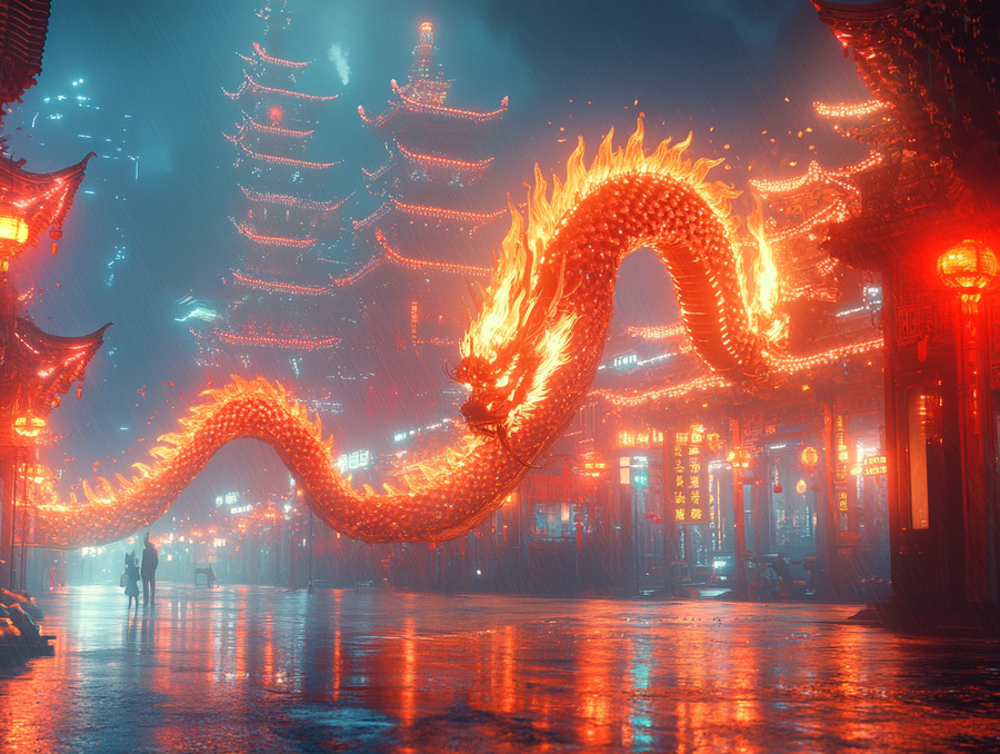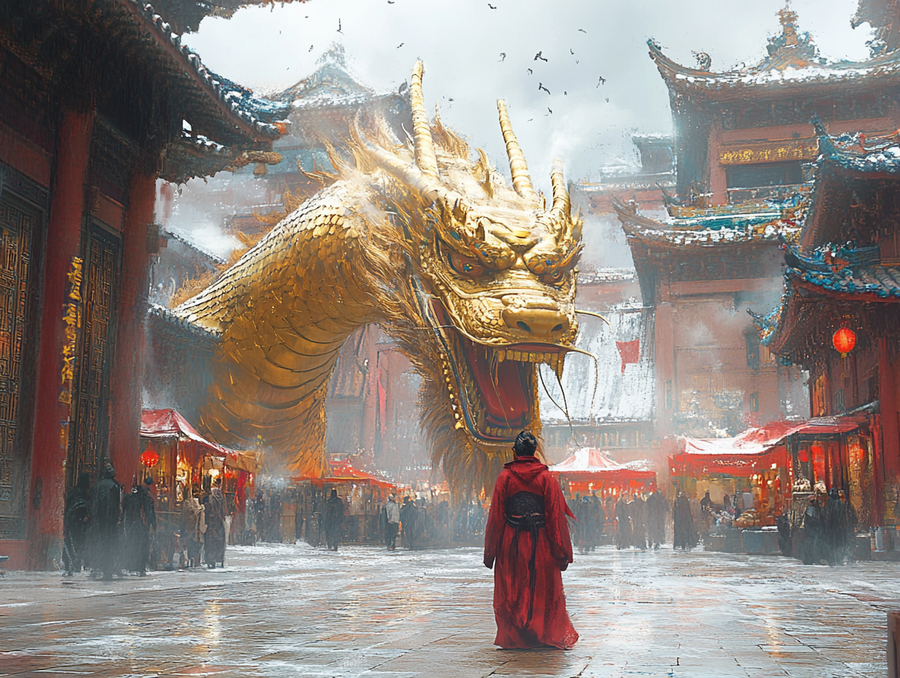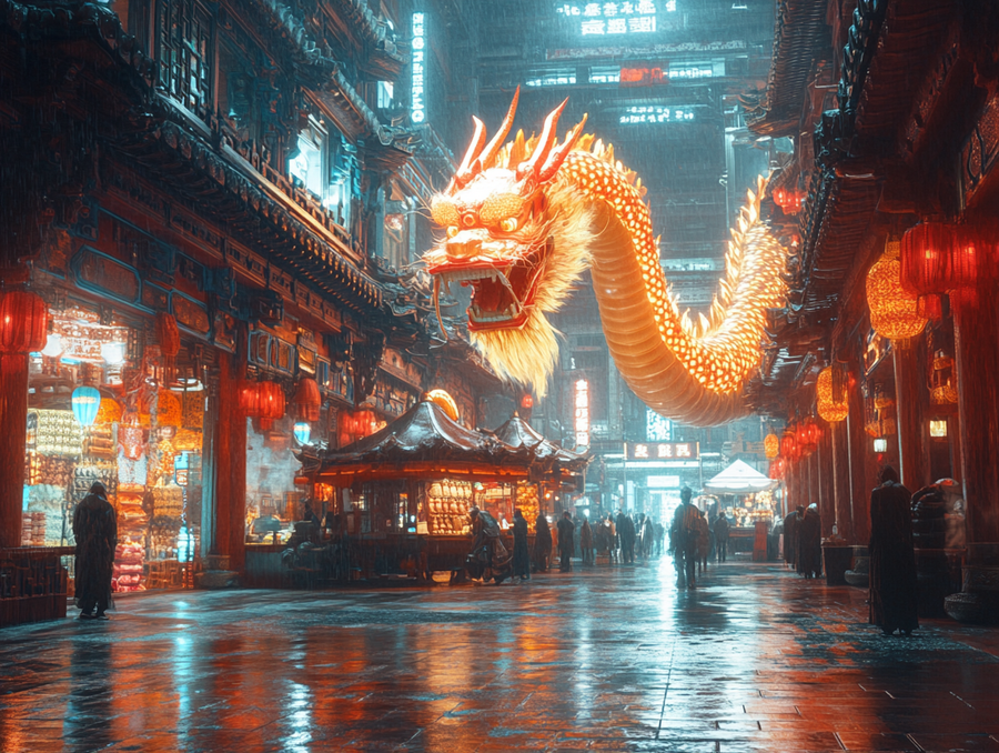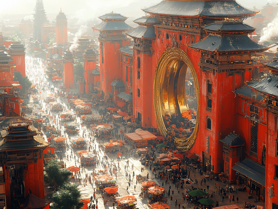 A sprawling futuristic bazaar stretching across the Kazakh steppes, with vibrant neon-lit marketplaces built inside repurposed Soviet concrete structures, alongside towering Chinese pagodas and modular Vietnamese trading posts. High-tech yurts with interactive digital facades serve as mobile stores, shifting locations based on trade winds. A massive golden dragon sculpture coils through the heart of the city, acting as both a monument and a transport hub. The air is filled with the scent of incense, sizzling street food, and electric energy as traders sell AI-powered textiles and bioengineered silks. Ultra-HD, cinematic, cyberpunk yet deeply traditional, an epic fusion of cultures and technology. --chaos 5 --ar 4:3 --stylize 750