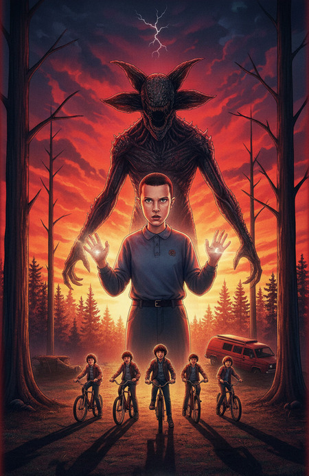 Создай изображение постера к первому сезону сериала Очень Странные Дела, без надписей, опираясь на реальные постеры сериала