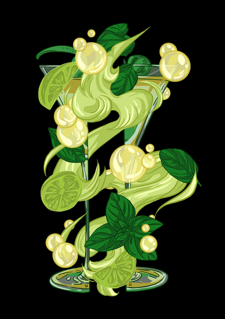 Цвета коктейлей отражают характер знаков зодиака. Стиль — плоская графика с декоративностью, мягкими текстурами и детализированностью.