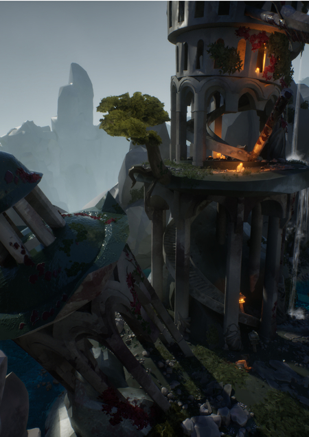 Игровой мир представляет собой некое пространство между жизнью и смертью, локация включает в себя несколько больших по размеру внеземных биомов, где находятся основные важные для сюжета объекты: руины древних городов и одиночные сооружения, исследуя которые игроку раскрывается основной лор.