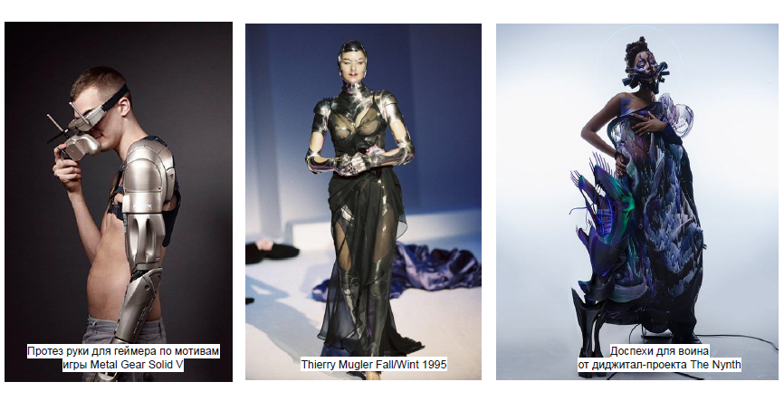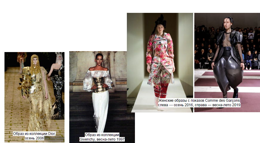 Потом Елизавета встретила эту метафору в других текстах, но при этом исследователи ее не объясняли, не раскрывали ее смысл до конца. Поэтому аспирантка решила написать про это свою работу и стала изучать, как доспехи переосмысляются сейчас в модной индустрии. Оказалось, что элементы доспехов могут подчеркивать воинственность или наоборот женственность, могут ассоциироваться с прошлым или с андроидами будущего.