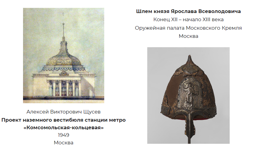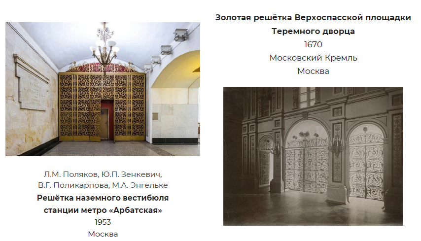 Валерия попробовала посмотреть на историю советской архитектуры через призму национального дискурса. Оказалось, что Щусев, например, часто обращался к формам древнерусской культуры. А на станции метро Арбатская мы видим такую же решетку, как в Теремном дворце XVII века.