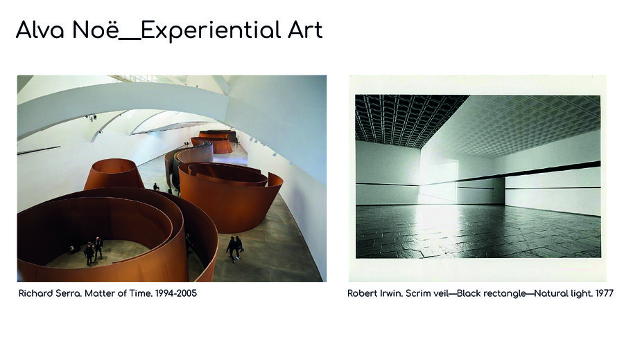 Ноэ подразумевает, что искусство является воплощением идей и пространством для интенсификации нашего восприятия. Примером этого служит работа Ричарда Серры, которая побуждает зрителей активно исследовать пространство и воспринимать его через свое тело.