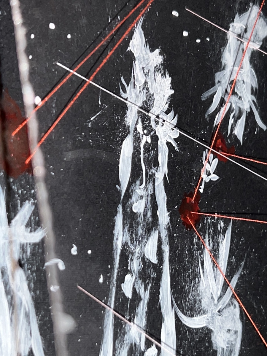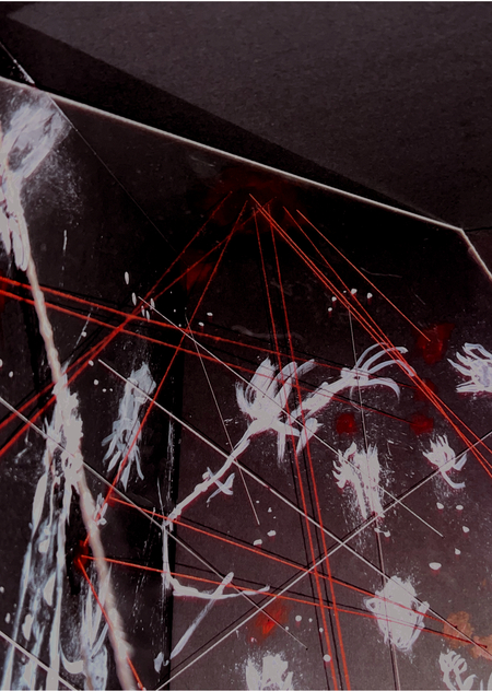 Перекрестие красных нитей в центре. (крест как знак выбора, позиции, неизбежной точки принятия решения)