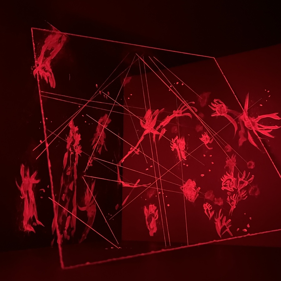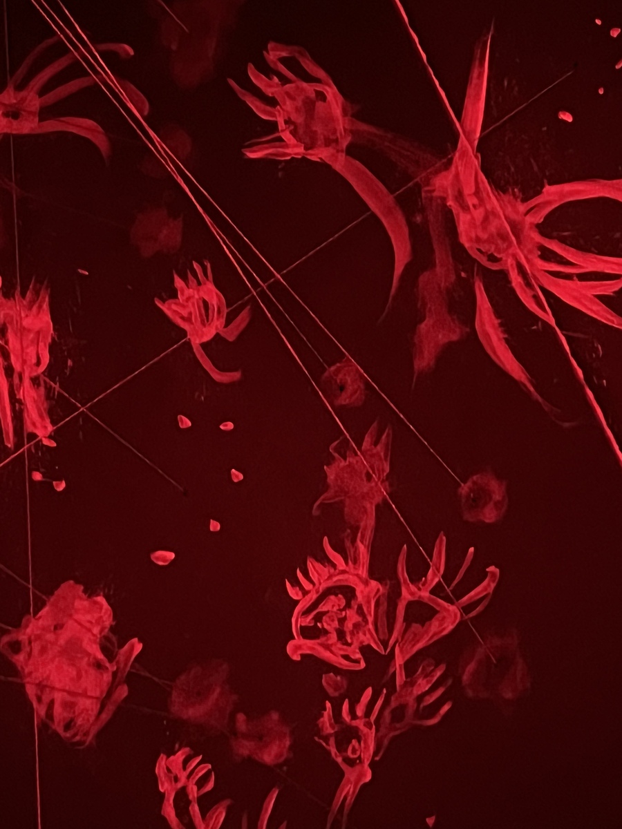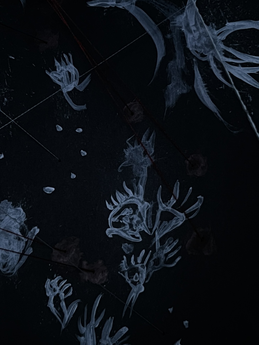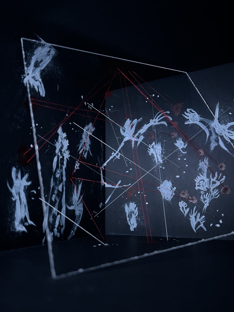 Белые нити соединяют внешние «руки» между собой, формируя сеть навязанных мнений. Красные нити, напротив, поднимаются вверх, собираясь в единую точку — символ личного внутреннего суждения. Однако в центре красные и белые нити перекрещиваются — показывая, что собственное мнение всегда формируется под влиянием навязанного.»