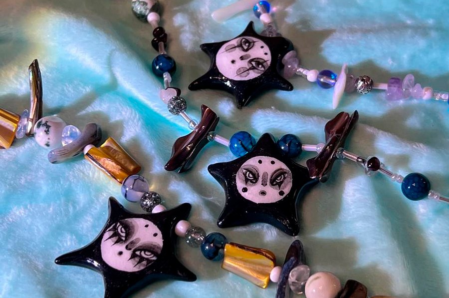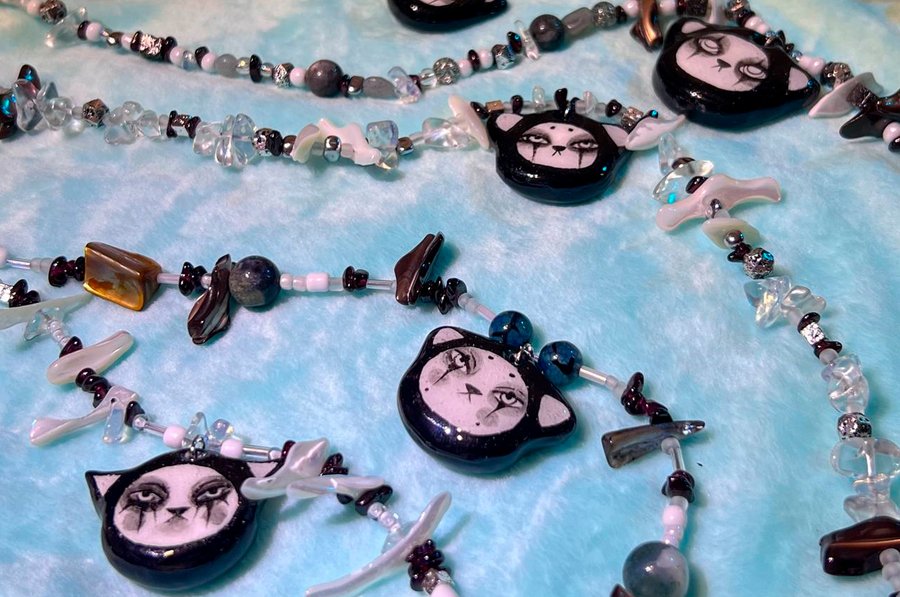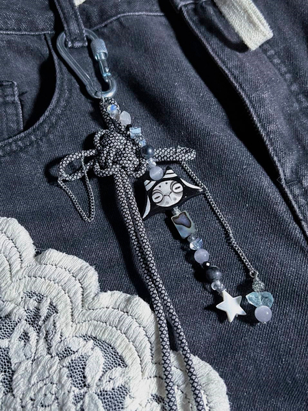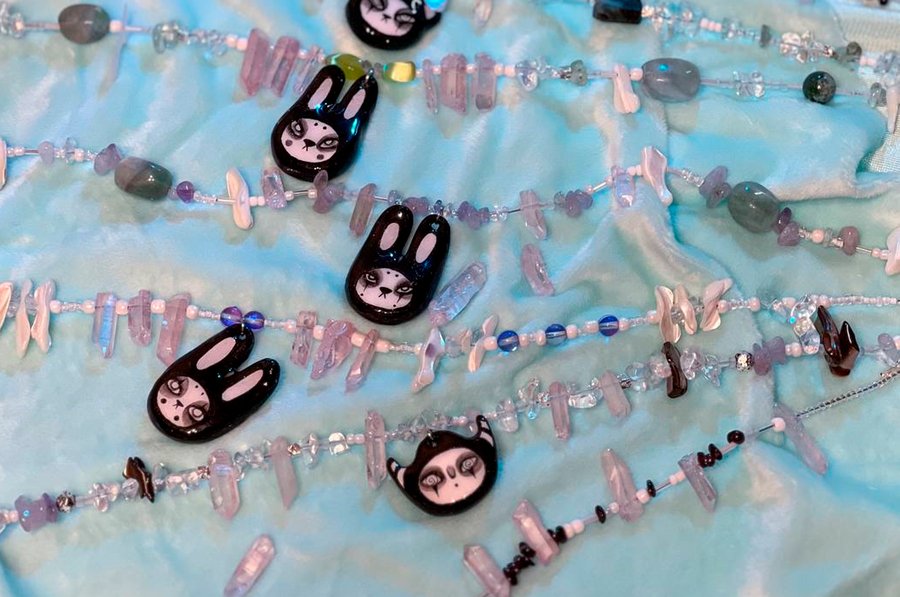 The jewelry is distinguished by a unique stylistic identity, consciously constructed upon a foundation of contradictions and contrasts. The pieces harmoniously blend cute and dark aesthetics, juxtaposing smooth, rounded forms with sharp, irregular ones, and combining hand-sculpted clay figurines with natural stones. This deliberate fusion of disparate elements creates a striking and unconventional accent for any personal style.