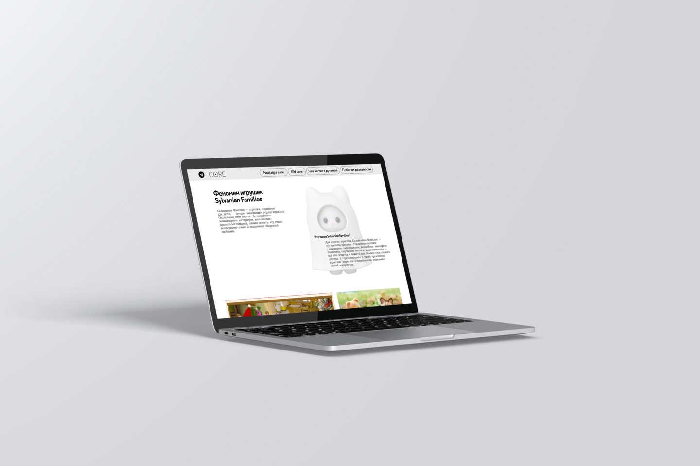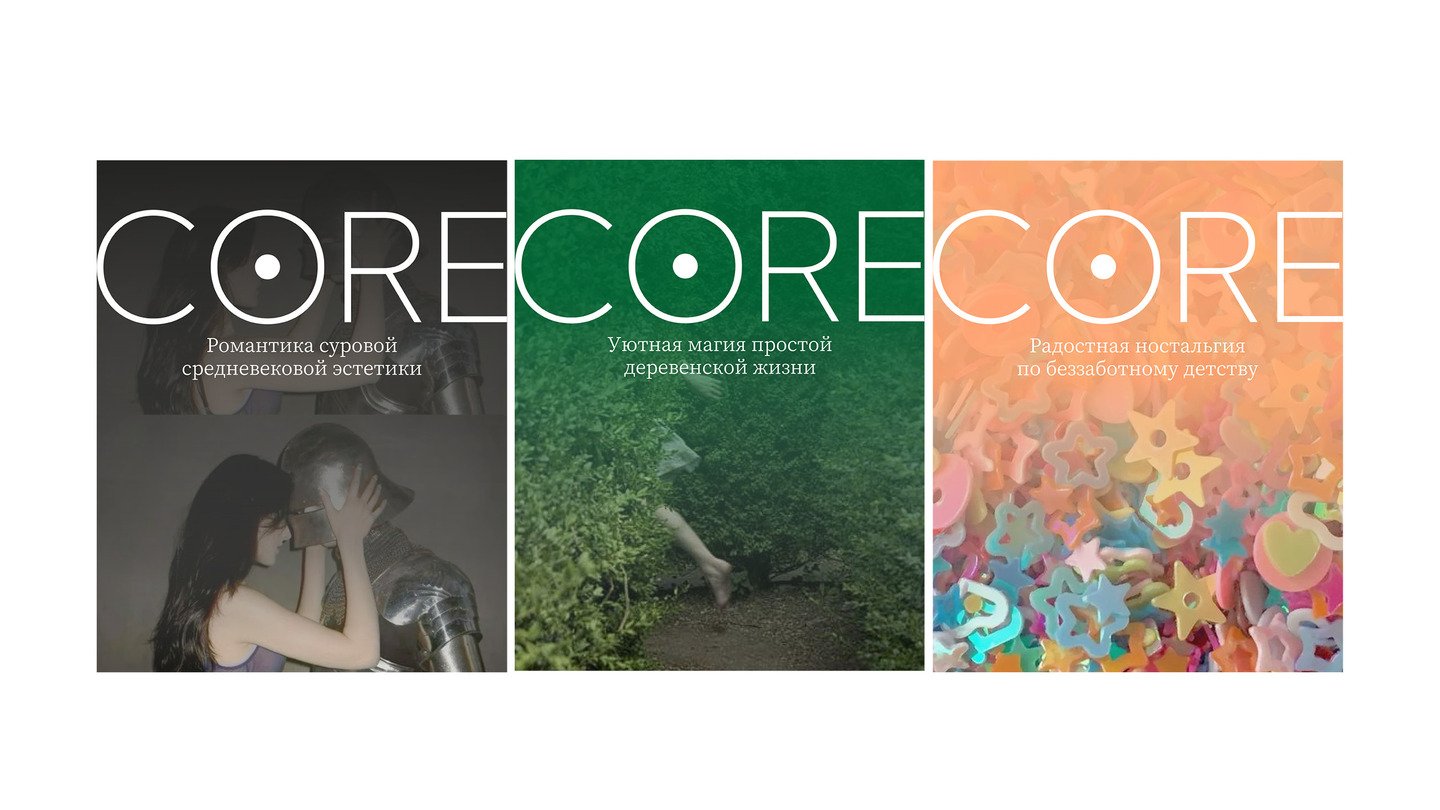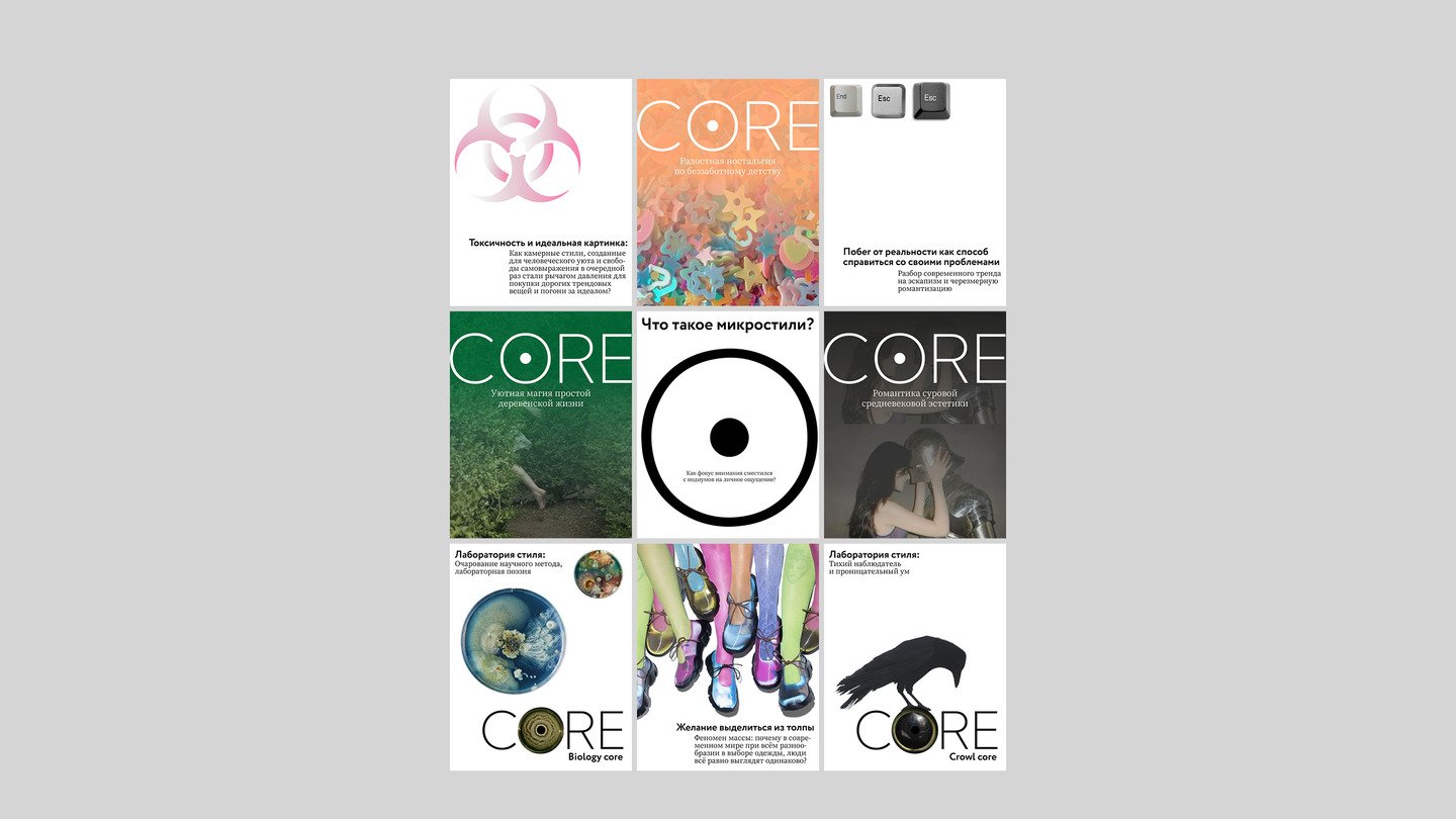 Рубрики медиа: 1. CORE — основная рубрика, в которой разбираются на составляющие популярные сейчас эстетики (что за стиль, на чём основан, почему нравится, какой архетип люди хотят примерить или в какую атмосферу погрузиться). 2. CORE lab — экспериментальная рубрика, которая предлагает пользователям медиа (или редакции) самостоятельно собрать жизнеспособную эстетику, которой ещё нет, чтобы попробовать понять, на чём основана популярность микростилей. 3. Interview CORE — рубрика, которая выходит в виде подкастов и расшифрованных в текст статей. Основными гостями являются специалисты области маркетинга, рекламы и психологии. 4. NEWS CORE — рубрика, которая выпускает новости, связанные с интернет эстетиками.