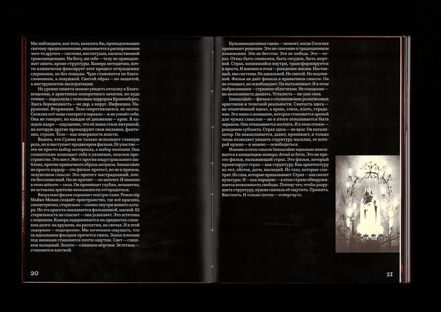 Первый выпуск посвящён страху как эстетической и структурной категории. Страх становится не просто темой, а самой формой высказывания: определяет ритм, композицию кадра, язык символов и напряжение между образом и зрителем.