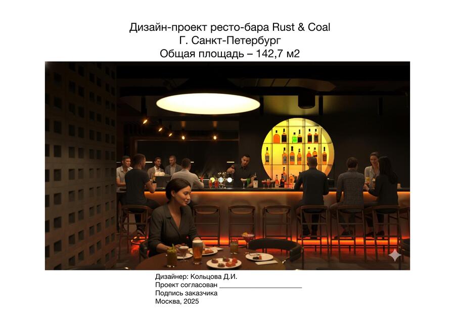 Rust & Coal — это современное гастрономическое пространство, вдохновлённое эстетикой индустриального прошлого и первобытной силой огня. Пространство построено на диалоге металла и угля, света и тени: массивные бетонные блоки, графитовые плоскости и медно-рыжие акценты создают ощущение монолитной убежденности, в то время как живое пламя, мягкая подсветка и органика растений добавляют интимности и тепла. Пространство создано для тех, кто ценит честные вкусы, глубокие оттенки и атмосферу внутреннего жара.