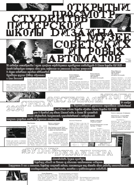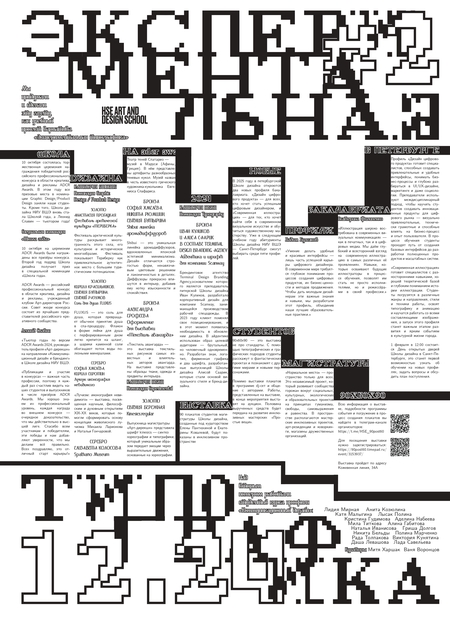 Комплекс типографических клаузур: портрет, натюрморт, пейзаж, выполненных в техниках аппликации и цифрового коллажа. Экспериментальный леттеринг. Дизайн газетных полос формата 420×578 мм по текстам новостей Школы дизайна.