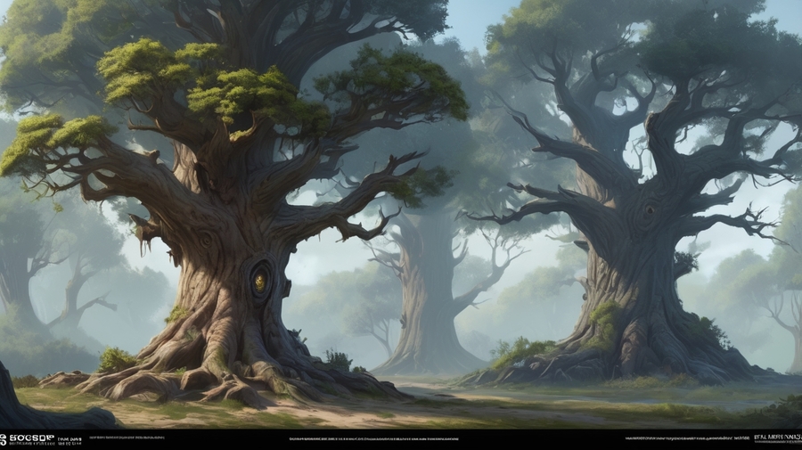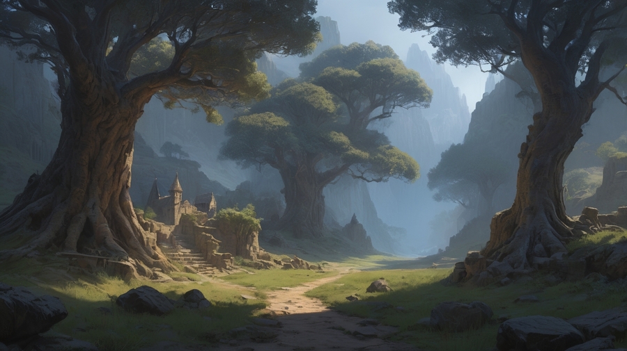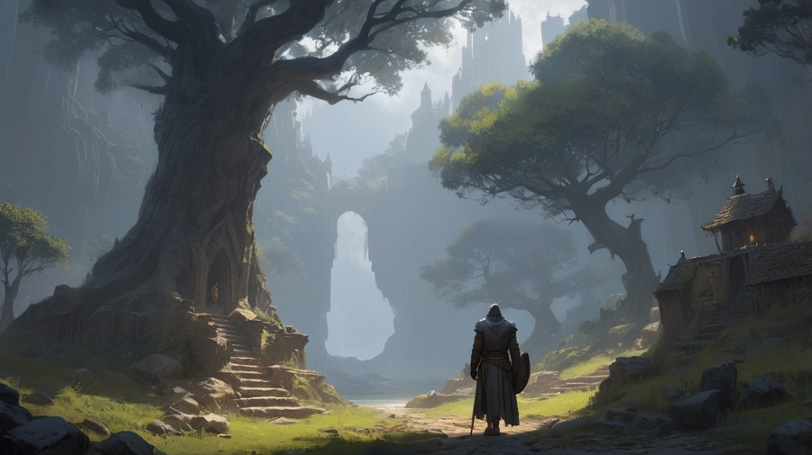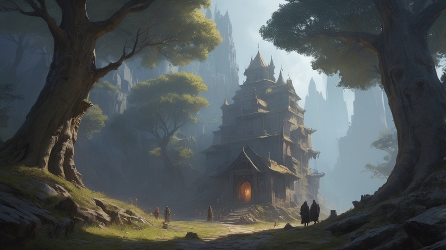 Prompt: Realistic medieval image. Landscape in a forest. In the background is a rock with a passage in it. To the right and left are small Asian temples for gods. On the right stands a man with his back to the camera. To the left spreads a large tree. Beautiful and sunny image