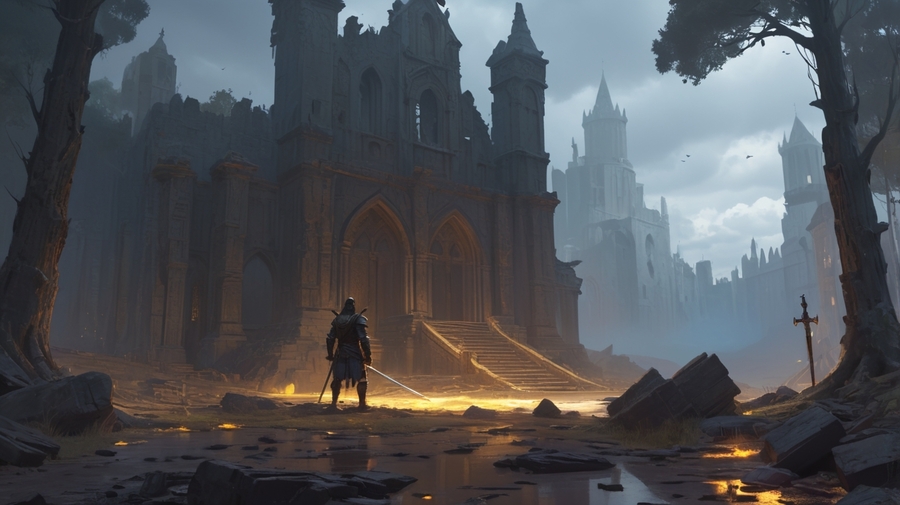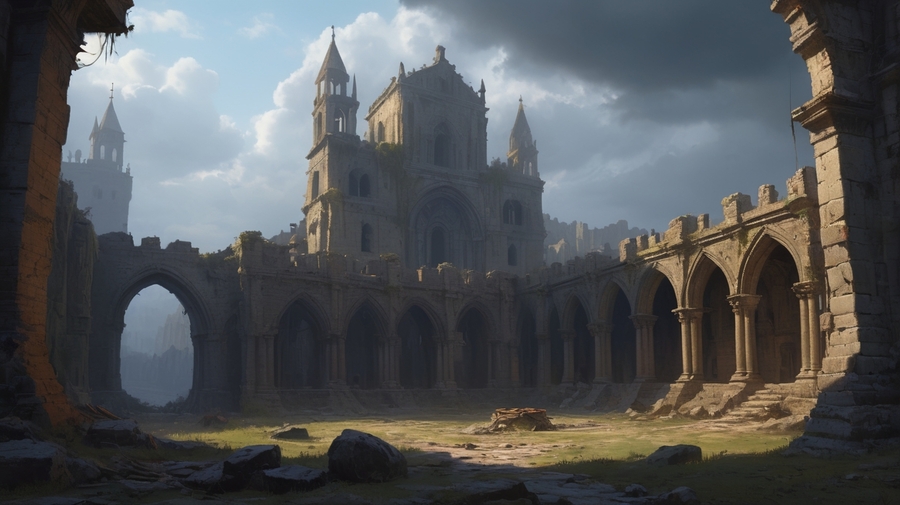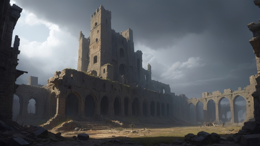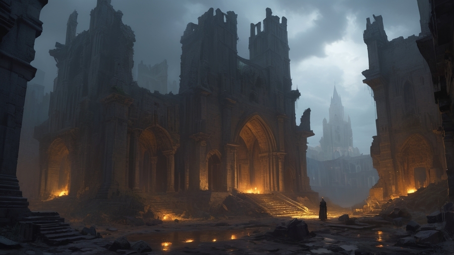 Prompt: Realistic medieval landscape. The ruins of a huge architectural masterpiece, night, the sky is overcast. The picture is gloomy and dark