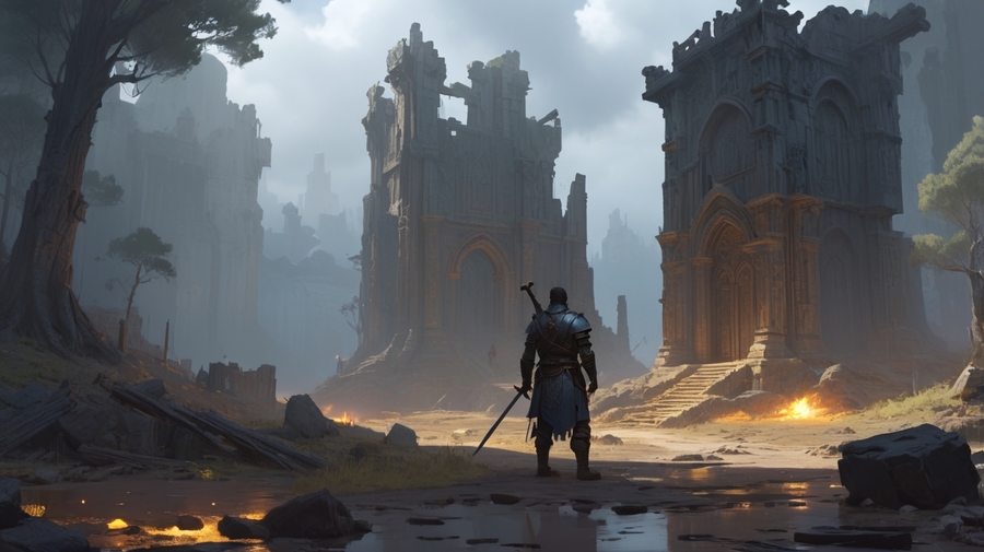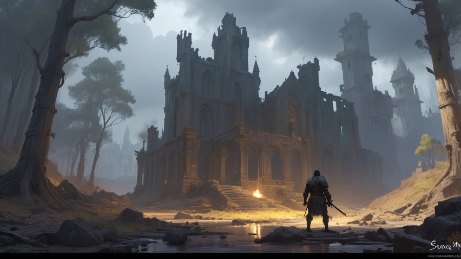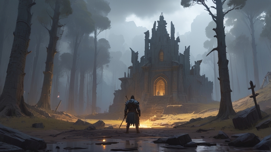 Prompt: Realistic medieval landscape. A small silhouette of a warrior stands in a forest clearing, we see him from the back. He holds a sword in his lowered hand. In front of him are the ruins of a small village.
