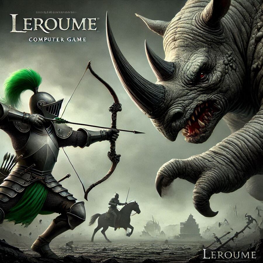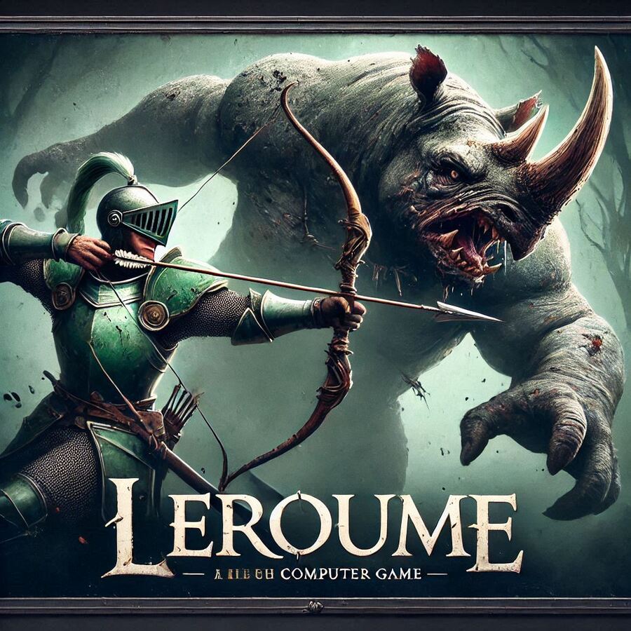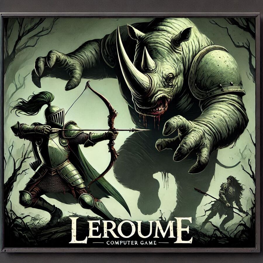 Prompt: Advertising poster for the computer game «Leroume». A knight in green armor with a bow aims at a monster the size of a horse. The monster has claws and fangs and looks like a rhinoceros. Dark and gloomy image. In a bottom of an image there is a text «Leroume»
