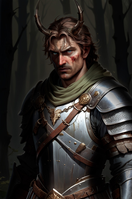 Prompt: Realistic full-length portrait in medieval style. The brooding warrior looks forward, his arms crossed on his chest, with a downcast gaze and a deep sense of sorrow and desperation in his haunted eyes. In the background, a dark, foreboding, and twisted night forest looms, with withered trees that seem to reach out like skeletal fingers, and fireflies flickering like malevolent sparks. Shadows dance across the warrior’s face, accentuating the scar on his left cheek, while the faint, glowing angelic halo above his head casts an eerie, otherworldly glow. His worn, battered chain mail armor appears rusted and broken, and the green bandage on his shoulder is stained with dark blood, symbolizing his mortal wounds and inner turmoil.