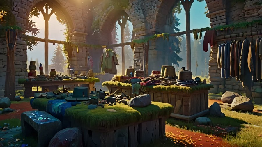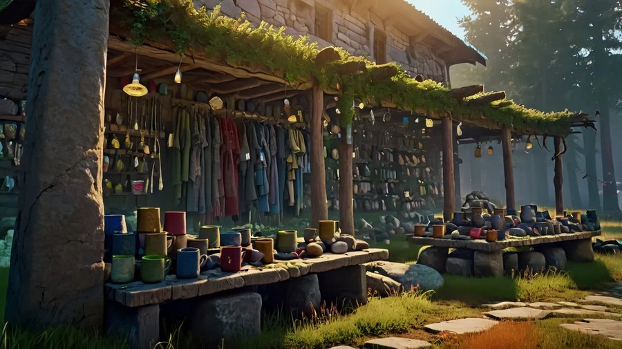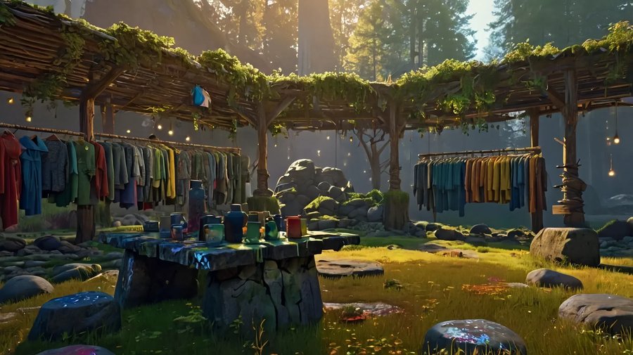 ПРОМПТ: A serene outdoor setting in a forest. There are two wooden structures covered with greenery, resembling pergolas. Clothes of various colors hang neatly on rods beneath the structures. In the foreground, a stone table is adorned with assorted jars and cans that appear to contain paint. Sunlight filters through the trees, casting a warm glow over the scene, while the ground is strewn with rocks and grass. The atmosphere is tranquil and enchanting.