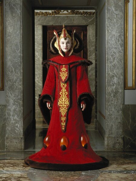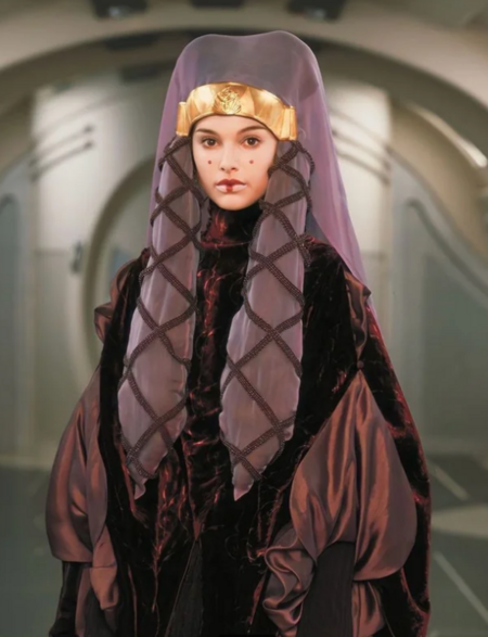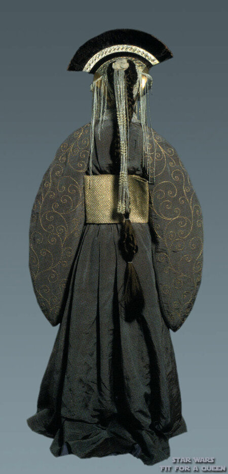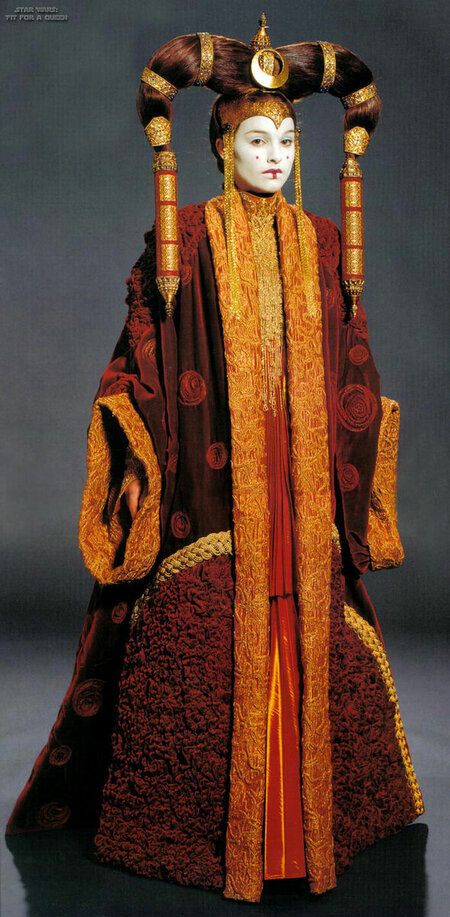 Один из самых известных образов Падме, появляющийся в первом фильме с её участием. Примечательна причина подобного формообразования костюма: он закрытый, не только полностью скрывающий тело, но и частично закрывающий черты лица героини. Связано это с тем, что по сюжету у Падме был двойник, который маскировался под неё и менялся с ней местами. Это было нужно для достижения её безопасности и запутывания врага.