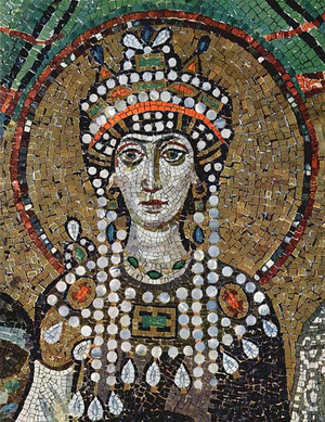 Слева: Кадр из фильма «Звездные войны: Эпизод I — Скрытая угроза» (реж. Джордж Лукас, 1999) Справа: Мозаика с изображением императрицы Феодоры (базилика Сан-Витале, VI век)