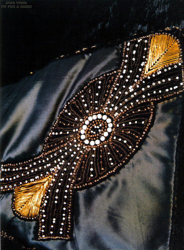 Слева: промо-фотография Падме Амидалы в наряде для пребывания за пределами Набу, 1997-1998 Справа: вышивка на наряде для пребывания за пределами Набу, 1994-1997