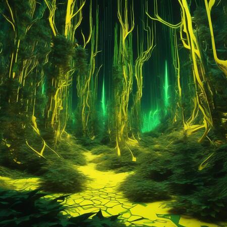 Промпт: an image of a futuristic forest at night, erosion algorithm landscape, yellow and green, in a corrupted forest, dmt realm, inspired by Herbert Abrams, anamorphic widescreen, videogame screenshot, by Derf,