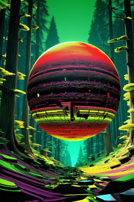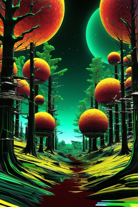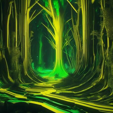 Промпт: an image of a futuristic forest at night, erosion algorithm landscape, yellow and green, in a corrupted forest, dmt realm, inspired by Herbert Abrams, anamorphic widescreen, videogame screenshot, by Derf, inspired by Charles Hinman, by Erwin Bowien