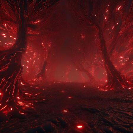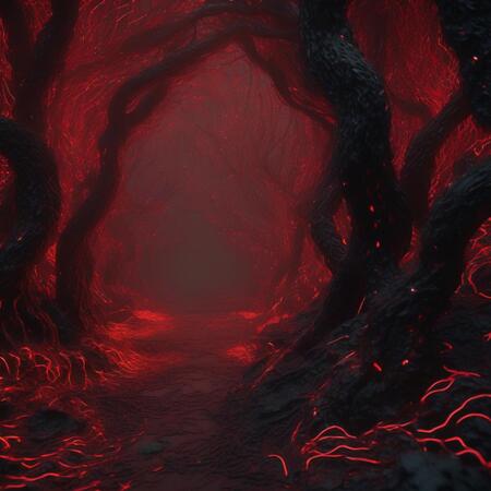 Промпт: a forest filled with lots of red lights, perlin noise, unreal engine 5, red narrow lava rivers, neural pointillism, hd 4d, warp, deep complexity, inspired by Andrei Kolkoutine, neurons, branching hallways, in a black room, highly realistic bump map, low dof