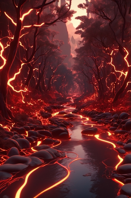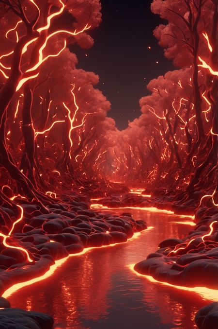 Промпт: Big Red River in the center, a digital forest filled with lots of red lights, perlin noise, unreal engine 5 poster, neural pointillism, warp, deep complexity, neurons,