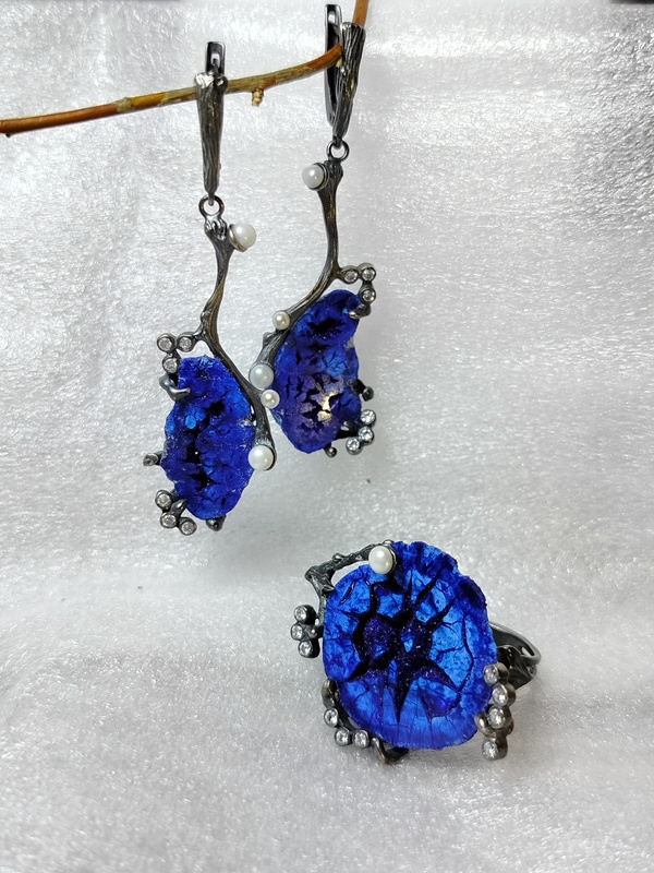 Set of ring, earrings «Revival» By Marina Shcheglova Outer space, the void in which movement takes place. Birth and death, and rebirth… The Earth bud is a symbol of spring and the awakening of nature on Earth. Everything is cyclical, and this gives hope for a revival. The Azurite stone conceals the cosmic blue, silver streams-stems move the stars (cubic zirconia), sprouting buds somewhere and carrying away the seed of life of the universe (pearls). The fragility of the stone does not allow counting on everyday wear. The design of the product is democratic and designed for all age categories. The technique is casting according to the smelted model, with further oxidation. 2024. In a single copy. The total weight of the set is 27.6 g. silver. The price is 70,000 rubles.