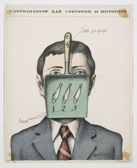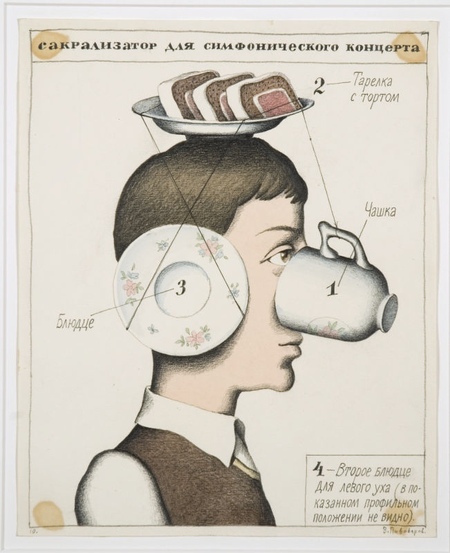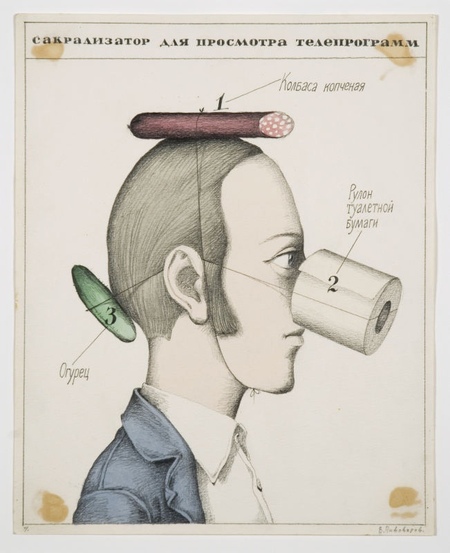В. Пивоваров в серии картин «Сакрализаторы» «совмещает» обычного советского человека с разными бытовыми предметами. Художник создает концепт приспособлений для «защиты внутреннего от внешнего» [2]. Эта серия, как и сами приборы, кажется абсолютно бессмысленной, при этом каждая картина выглядит нарочито сухо и формально. Автор имитирует стиль «инструкции», чтобы создать еще больший контраст между систематизированными указаниями и абсурдностью нарисованного.
