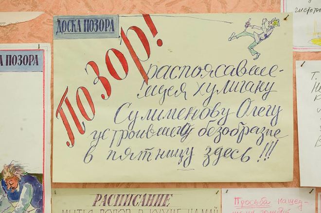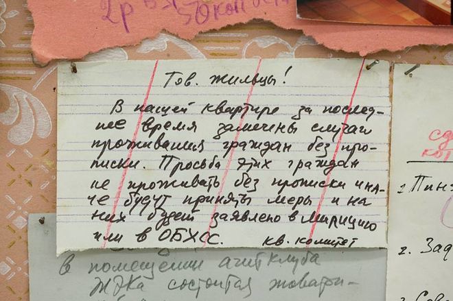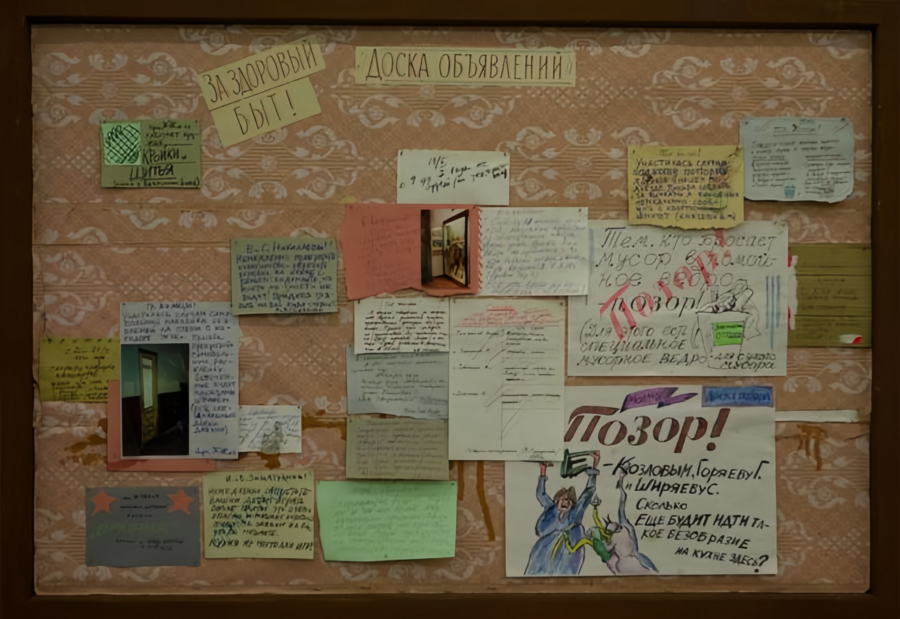 В инсталляции «Воспоминания о коммунальной кухне» И. и Э. Кабаковы размещают на доске объявлений записки и объявления для жильцов коммунальной квартиры, начиная графиком проветривания и заканчивая просьбами заменить окно. В этой инсталляции И. Кабаков иронизирует над постоянным «требованием чистоты и нравственности» [3] в советском жилом пространстве. Квартирный комитет, от чьего имени написаны многие назидательные записки, имитирует власть, под давлением которой советский человек находится даже у себя дома. «Воспоминания о коммунальной кухне» повествуют об абсолютном отсутствии частной жизни и личного пространства, без возможности отстраниться или не участвовать.