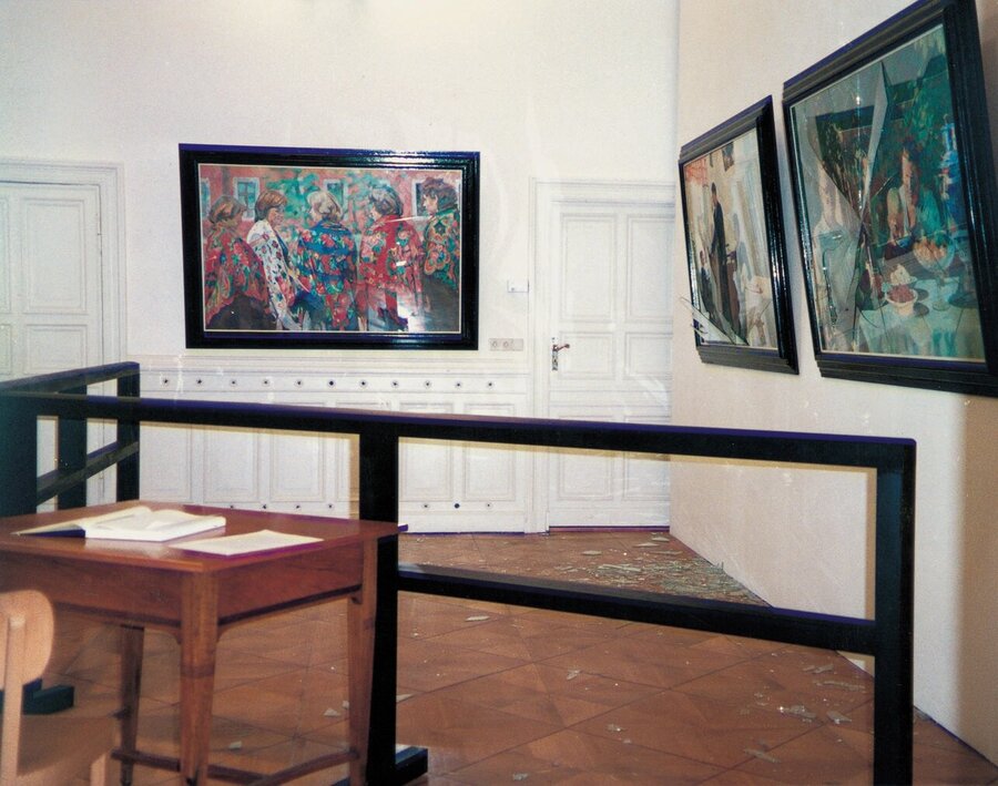 А в другой работе под названием «Мир война» А. Косолапов противопоставляет «советские» ценности «западным». Художник имитирует идеологическую пропаганду, и только последняя строчка дает зрителю понять всю иронию произведения.