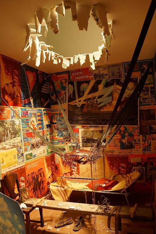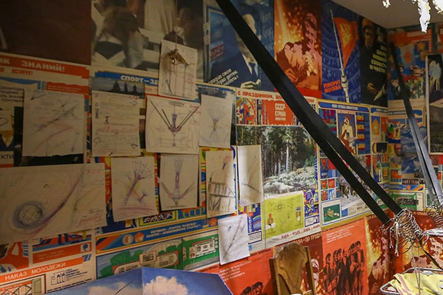 Также стоит упомянуть об инсталляции «Человек, улетевший в космос из своей комнаты», которая является одной из самых известных работ И. Кабакова. Сама инсталляция изображает комнату, обклеенную советскими плакатами, кровать, письменный стол, а также два стула, на которых лежит доска. Зритель сразу замечает устройство, похожее на катапульту, и дыру в потолке — свидетельства о том, что человек, живший в этой комнате, «улетел в космос».