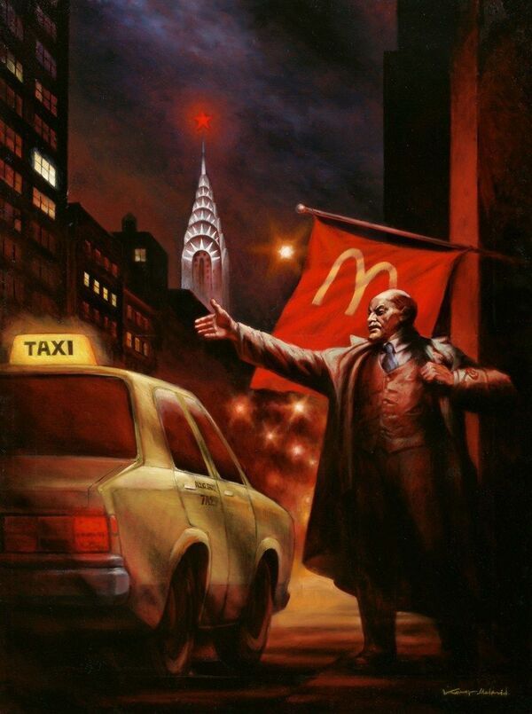 Ленин стоит в своей знаменитой позе с вытянутой вперед рукой, которая должна направлять народ, пробуждать в людях дух революции, но в предложенных обстоятельствах все выглядит так, будто Ленин поднял руку, чтобы поймать такси. На Empire State Building горит красная звезда, а за спиной у Ленина красное знамя, имитирующее советский флаг, но с логотипом «МакДональдса».