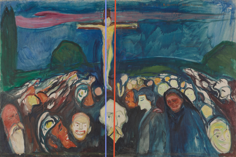 Таким образом, Эдвард Мунк действительно очень узнаваемо изобразил евангельское Распятие Христа, но ещё и переосмыслил его в контексте своего внутреннего мира и эпохи своего времени. Он создал настоящий памятник сочетающий в себе экзистенциальные и упаднические мотивы конца века и эмоциональную интерпретацию Голгофы Иисуса и «Голгофы» художника.