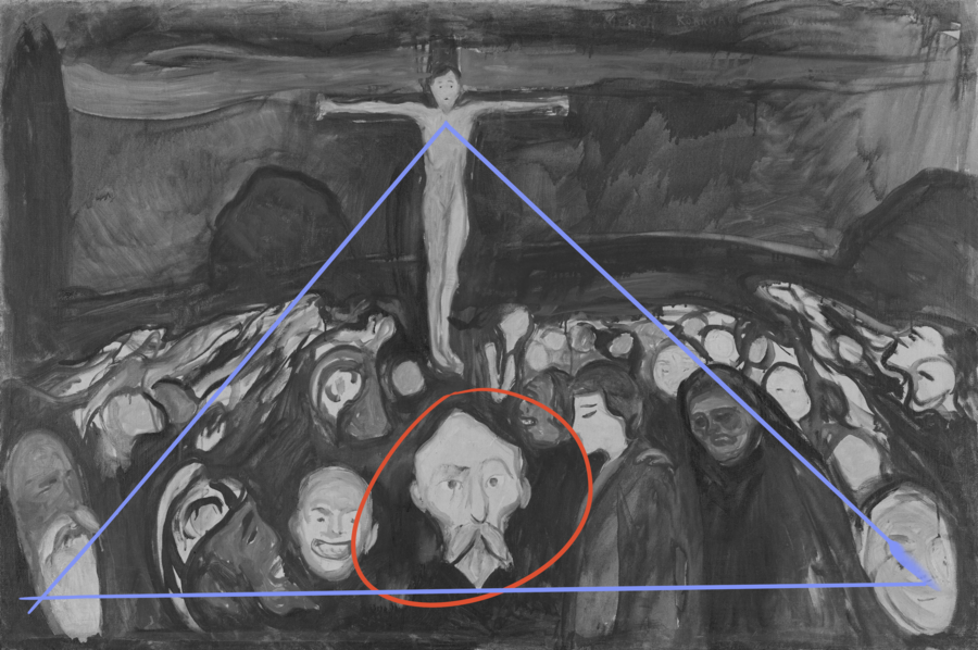 Далее идут более незаметные символы. Несмотря на казалось бы отсутствие деталей в картине, Мунк очень тщательно выбирает образы, раздваивая свой сюжет на символический и библейский. Если приглядеться к толпе с иконографической точки зрения, можно заметить несколько личностей традиционно присутствующих в изображении Голгофы.