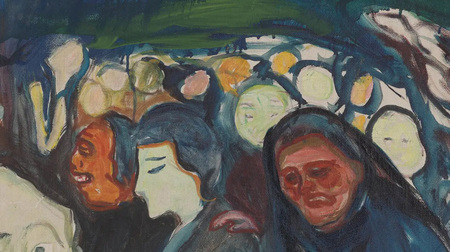 Люди говорят между собой, смотрят в другую от креста сторону или мирно наблюдают за кровавой казнью. Иногда они изображены очень меленькими, чтобы еще больше утрировать массовость безучастности народа к мучениям невиновного. И Мунк смешивает толпу в одно больше пятно, надвигающееся на крест, задавливающее его своим равнодушием. В его картине мы видим пик символизма толпы.