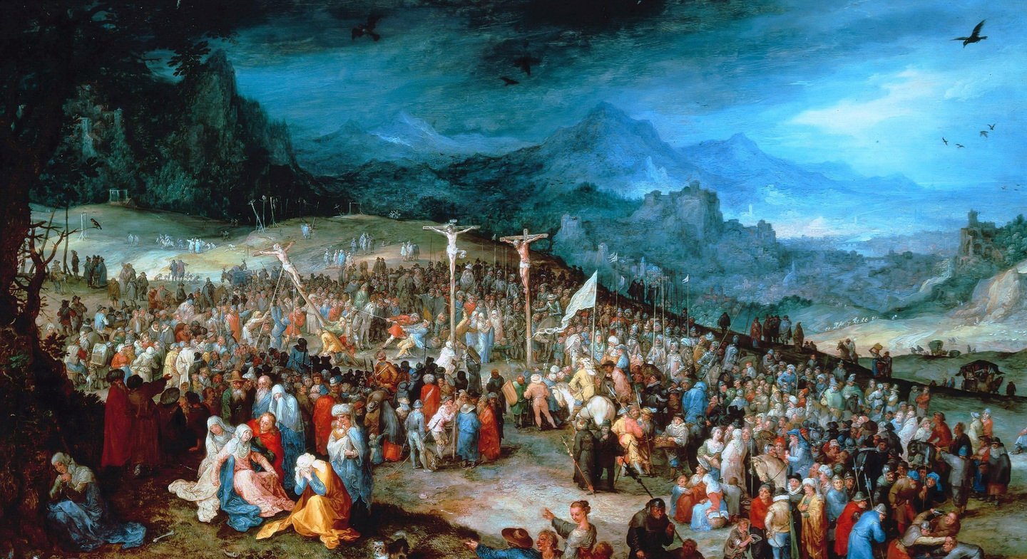 (1) — Андреа Мантенья. Распятие, 1457–1459 гг. (2) — Ян Брейгель Старший. Голгофа, 1598 г.