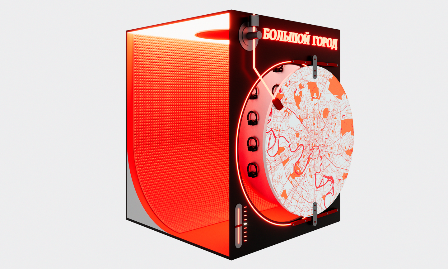 Концепция инсталляции «ЗВУКОГРАФ» — это создание иммерсивной медиакапсулы в форме куба, вход в которую выполнен в виде гигантской виниловой пластинки с гравировкой карты города.