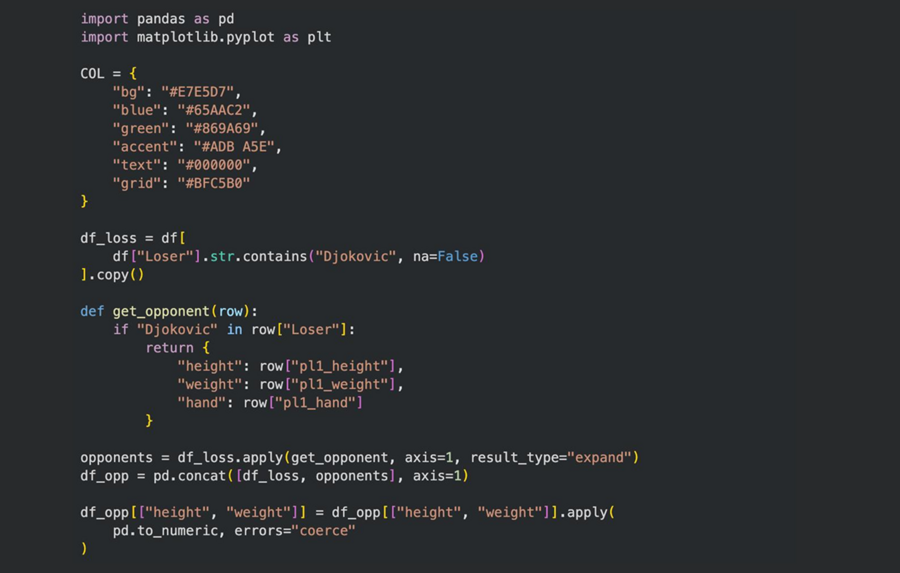 Заключительный график посвящён анализу характеристик игроков, которым удавалось обыгрывать Новака Джоковича. На нём сопоставляются различные параметры матчей и соперников, что позволяет предположить, какие факторы могут играть ключевую роль в победе над одним из сильнейших теннисистов в истории. Анализ смещает фокус с абсолютных результатов на условия и контекст отдельных матчей.
