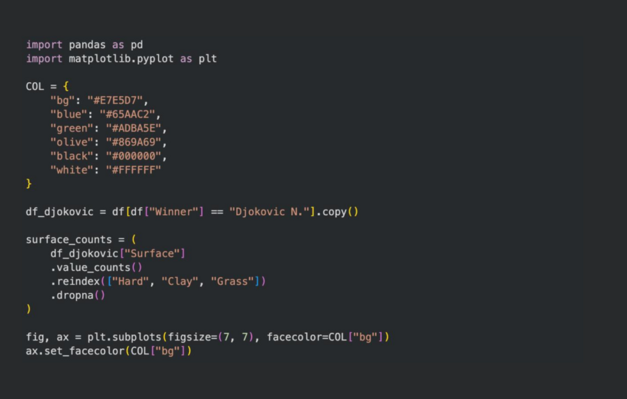 Работая над визуальным стилем проекта, я хотела передать ощущение спортивной динамики и эстетики тенниса. Основой палитры стали приглушённые оттенки, которые ассоциируются с кортами, теннисными мячами и визуальной эстетикой спортивной статистики. Чтобы собрать нужную цветовую палитру я использовала Adobe Color. Эти цвета используются в графиках и общем визуальном решении проекта.