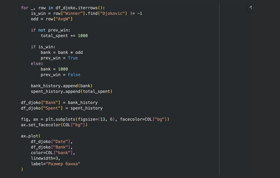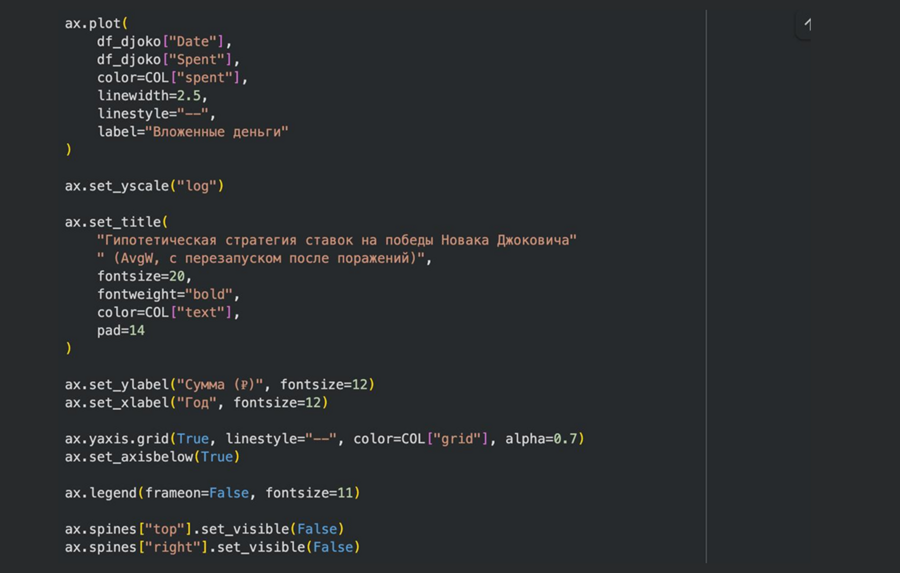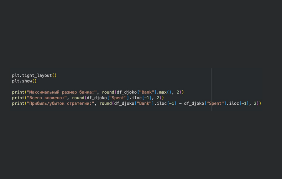 Третий график моделирует гипотетическую ситуацию: что произошло бы, если бы ставки всегда делались на победу Джоковича. Здесь используется логарифмическая шкала, так как значения банка могут расти экспоненциально. Визуализация показывает чередование резких скачков и затяжных периодов стагнации, подчёркивая, что даже стратегия, основанная на сильном фаворите, остаётся зависимой от серий побед и поражений, а не гарантирует стабильный рост.