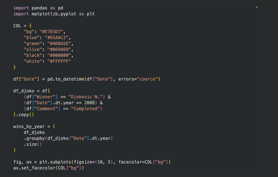 Во второй визуализации я сосредоточилась на динамике побед Новака Джоковича. График отражает изменение количества выигранных матчей по годам и показывает, что успех игрока не является равномерным, а формируется волнообразно — с периодами подъёма и относительного спада. Тем не менее общий тренд остаётся восходящим, что подчёркивает исключительную устойчивость его карьеры.