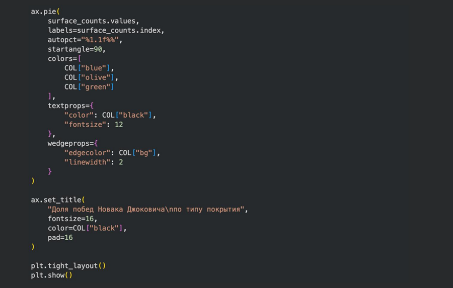Первый график посвящён сравнению теннисистов с наибольшим количеством побед за период с 2008 по 2022 год. Диаграмма показывает разрыв между лидерами тура и остальными игроками. Визуализация помогает оценить масштаб доминирования отдельных спортсменов и увидеть, насколько стабильно они удерживали высокие позиции на протяжении многих сезонов. Исходя из данных, меня заинтересовал игрок первой строки Новак Джокович, так как у него самый сильный показатель из всех. Его карьера стала главным фактором в моем интересе к данному виду спорта, поэтому далее более детально рассмотрим его спортивные достижения.