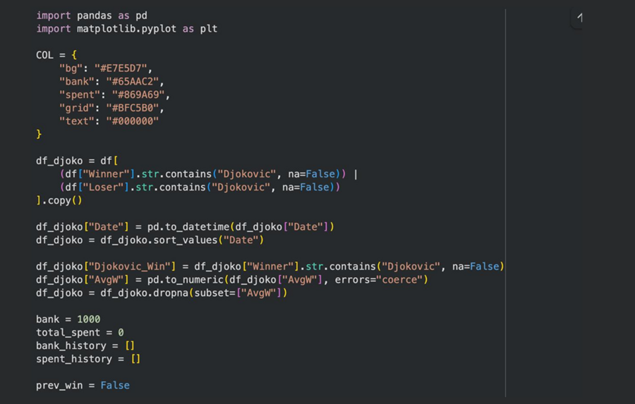 Работа позволяет рассмотреть теннис как систему, в которой спортивные достижения, стабильность формы и вероятностные модели тесно переплетаются. Центральной фигурой исследования стал Новак Джокович — один из самых доминирующих игроков современного тенниса. Мне было интересно проследить, как менялось количество его побед со временем, какие игроки составляли ему конкуренцию, а также проверить, насколько рациональной могла бы быть стратегия ставок, основанная на его стабильных результатах.